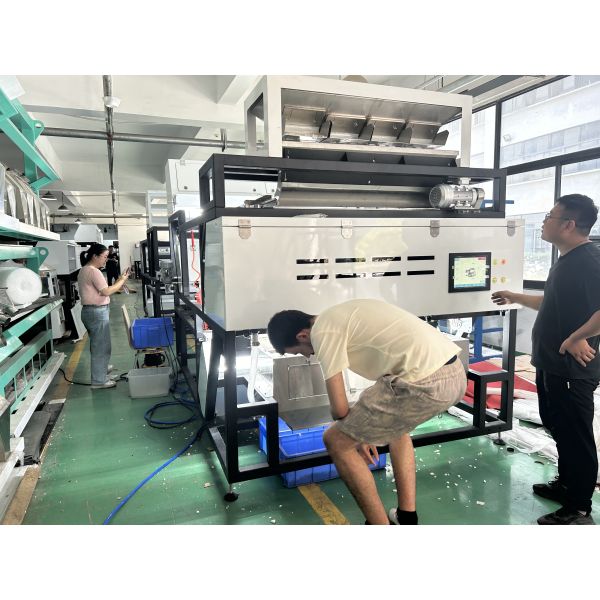 Raw materials are put into the machine from its material hopper on the top, vibrated by vibratiory feeder and sliding along material chute into the zone of observation in sorting chamber through sensors and background plate. Under the effect of lamps source, CCD sensor receives compound light from materials being sorted. According to the light intensity and color changes, make the system produce output signal and drive solenoid valve(ejector) to work, ejecting the discolor grain to reject chamber and good materials continue to fall into the finished accept chamber